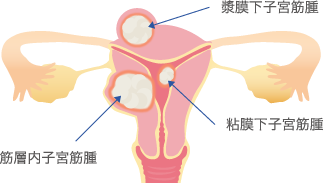子宮筋腫は女性の10人に3人に発症する良性の腫瘍です。生命を脅かすものではありませんが、放置しておくと10kgを超える大きさになることもあります。子宮筋腫は女性ホルモンによって大きくなりますが、閉経後には小さくなることもあります。複数できることが多く、その大きさやできた場所によって症状が違ってきます。子宮の内側(粘膜下筋腫)、子宮の筋肉の中(筋層内筋腫)、子宮の外側(漿膜下筋腫)に分けられています。