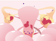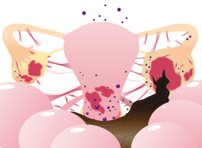 大きく広がった子宮内膜に似た組織が固まって、卵巣や卵管、腹膜、などが癒着してきます。卵巣の中で子宮内膜症が増殖した場合、卵巣の内部にチョコレート色の血液がたまり、チョコレート嚢腫(のうしゅ)と呼ばれるものができることもあります。この頃では、性交痛が現れ、月経痛も寝込むほどひどくなる人もいます。
