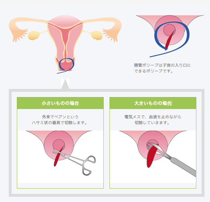 子宮頸管ポリープとは、子宮の入り口にあたる子宮頚管部分に粘膜の上皮細胞が増殖して形成される良性の腫瘍ができる病気です。通常3~5mmほどの大きさで、増大したとしても1cm程度だといわれています。がん化して悪性腫瘍となることはまれなので自覚症状がなければ放置していても問題はありませんが、妊娠を望む場合は切除する方向で治療を受けることが多いです。